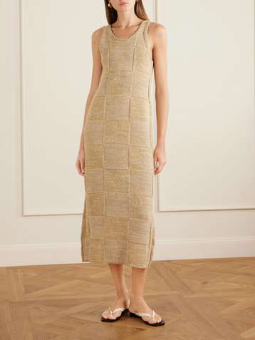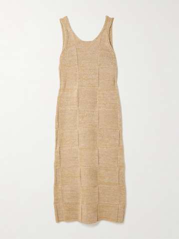 فستان متوسط الطول به قطع محاكة بجانب بعضها البعض من نسيج محبوك ومزيج من الكتان والقطن