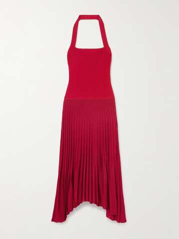 فستان طويل بحمالة عنق من قماش بليسيه ونسيج محبوك مطاط بتصميم مضلّع