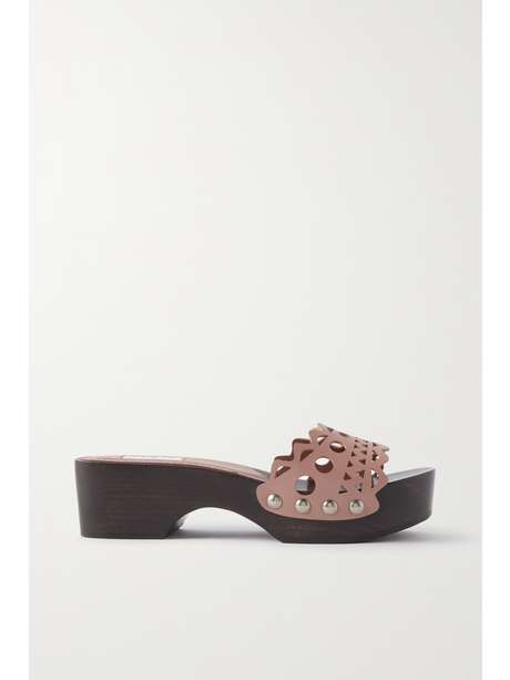 ALAÏA قبقاب من الجلد المقصوص بالليزر مزيّن بدبابيس معدنية بكعب 50 مم