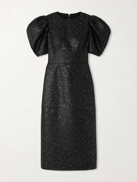 CAROLINA HERRERA فستان متوسط الطول من التويد بلمعة معدنية مزيَّن بأقراص برّاقة