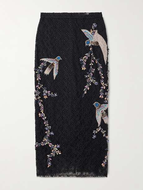 COSTARELLOS تنورة متوسطة الطول Vivi من الدانتيل المفرّغ مزينة بخرز وكريستال