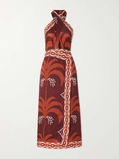 JOHANNA ORTIZ فستان طويل بياقة هالتر الدائرية من الكتّان بطبعات وفتحات