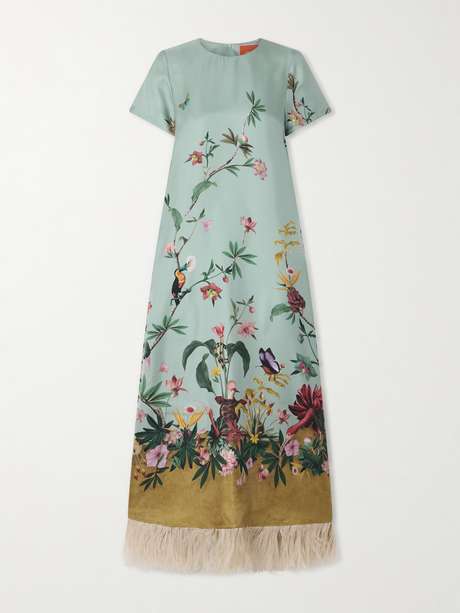 LA DOUBLEJ فستان طويل Swing من حرير التويل بطبعات ومزين بالريش