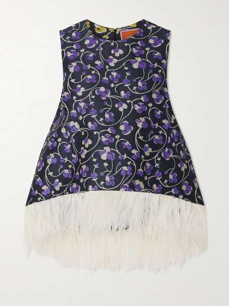 LA DOUBLEJ بلوزة La Scala بقصة غير متماثلة من الجاكار بلمعة معدنية مزينة بالريش
