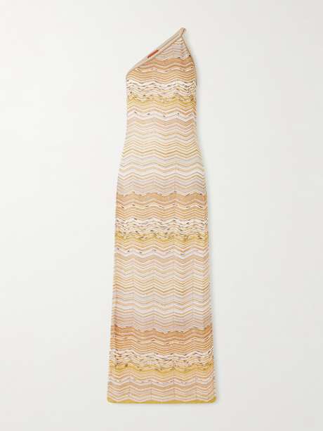 MISSONI فستان طويل بكتف واحد بحبكة الكروشيه ولمعة معدنية مخطط ومزّين بأقراص برّاقة