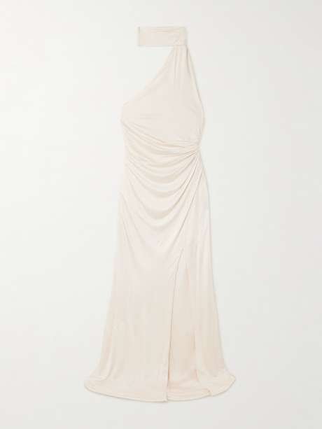 TOM FORD فستان سهرة بكتف واحدة وبياقة هالتر الدائرية من ساتان جيرسي مزموم بقطع محاكة بجانب بعضها البعض