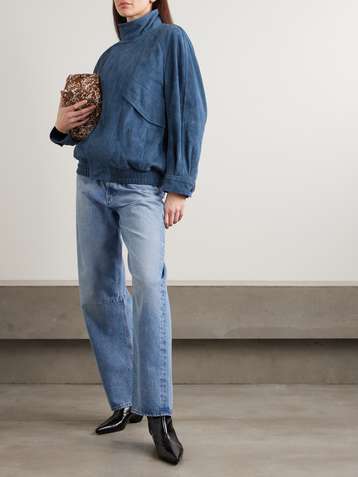 جاكيت Mandarin من جلد السويد بقطع محاكة بجانب بعضها البعض