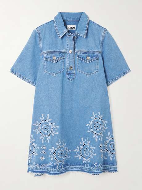 GANNI فستان قصير بأسلوب قميص من الدنيم بتطريز إنكليزي وحواف منسّلة