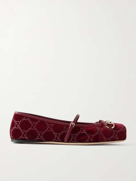 GUCCI حذاء باليرينا من المخمل وحواف من الجلد المزين بالكريستال مزينة بحلية هورسبيت