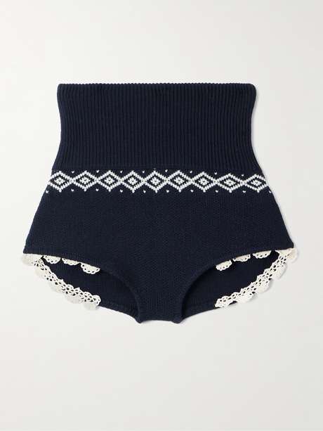 تقدم Magda Butrym هذا الشورت المحبوك بنقشة Fair Isle متباينة بحبكة الجاكار لمطابقة الحاشية المحبوكة بحبكة كروشيه متقنة. حُبك بالصوف بحبكة الجاكار وحبكة مضلعة ويتميز بخصر عالٍ جداً وحواف قصيرة للغاية. تتوفر في تشكيلتنا أيضاً الكنزة المطابقة.