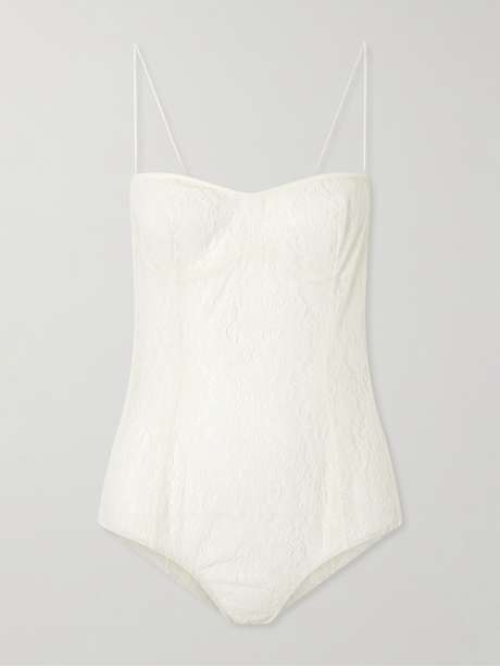 Pauline Dujancourt’s 'Seagull' bodysuit is crafted from sheer lace in a close-fitting silhouette that contours the body. The intricate pattern lends a romantic yet modern edge.