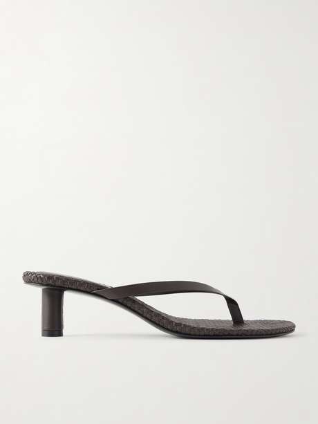 ST. AGNI’s sandals are shaped with slim leather thong straps and set on a sculptural cylinder heel. A woven insole adds tactile depth to the minimalist silhouette.