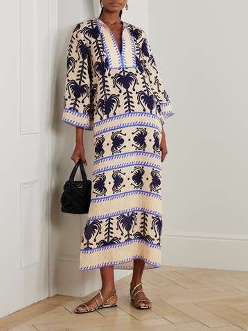 فستان طويل بياقة هالتر الدائرية من الكتّان بطبعات وفتحات