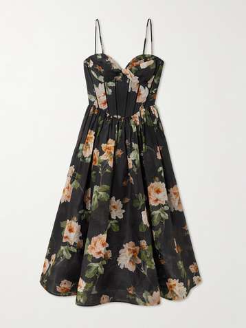 فستان متوسط الطول Isla من مزيج الحرير والكتّان بطبعة الأزهار بدون حمالات
