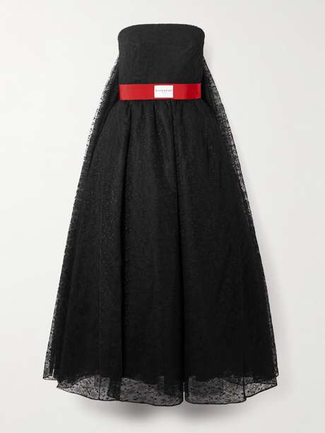 يستحضر هذا الفستان المتوسط الطول الأنيق من Givenchy إلى الأذهان تصاميم أرشيفية للعلامة من خمسينات القرن الماضي. صُنع في فرنسا من دانتيل فاخر بنقشة متقنة، ويمتاز عند الصدر بقصّة بوستيه من دون حمالات كتف ويأتي مشدوداً عند الخصر بحزام متباين اللون. استديري في المناسبات للكشف عن تصميمه المترف في الخلف بأسلوب الكاب الذي يمنح إطلالتك حضوراً آسراً لا يُنسى.
