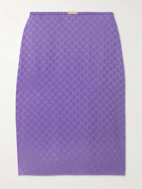 تمنحك Gucci لمسة عصرية على التنورة الكلاسيكية الانسيابية بتزيينها بشعار ‘GG’ الشهير، لتجمع بين الجرأة والأناقة المميزة للدار. وهي مصنوعة من الحرير بحبكة الجاكار، وتمتاز بقصّة ضيقة تُعانق القوام برقة، وحزام خصر مطاطي رفيع يزدان بقطعة معدنية ذهبية اللون تتّسم بشعار العلامة.