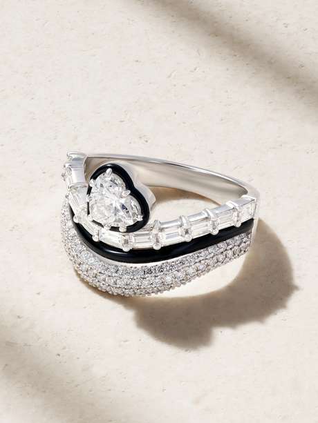 استوحيَ هذا الخاتم بتوقيع KAMYEN من تصاميم الآرت ديكو الساحرة. صُنع من الذهب الأبيض عيار 18 قيراط ويتسم بقصة مقوّسة مكدّسة تشمل خاتمَين مرصّعَين بالألماس مع مينا لامع باللون الأسود بينهما. يستقرّ قلب ناعم في الجزء العلوي بشكل مائل قليلاً نحو أحد الجانبين.