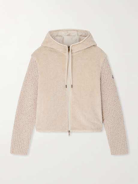 MONCLER كارديغان بقبعة من مزيج الصوف بحبكة بوكليه والصوف الناعم