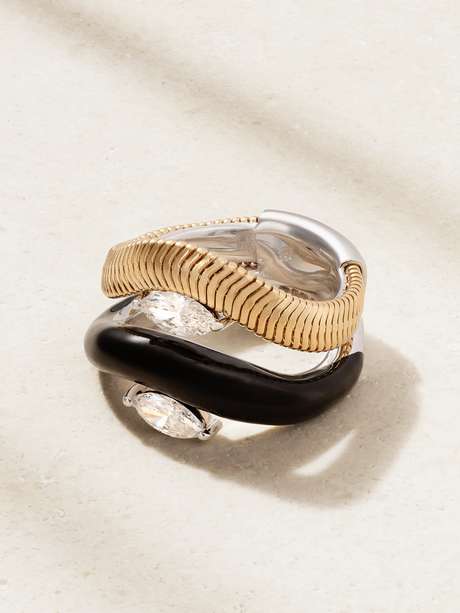 إنّ هذا الخاتم من توقيع Nikos Koulis مُصمّم على شكل تصميمَين متباينَين مكدّسَين فوق بعضهما البعض. فهو مصنوع من الذهب الأبيض والأصفر عيار 18 قيراط وتتخلله الحلقات المتميزة على شكل الأفعى والمينا اللامع. تتمركز حبّتان من الألماس بقصة ماركيز، بوزن إجمالي قدره 0.62 قيراط، في أسفل كل جانب أمامي مقوّس.