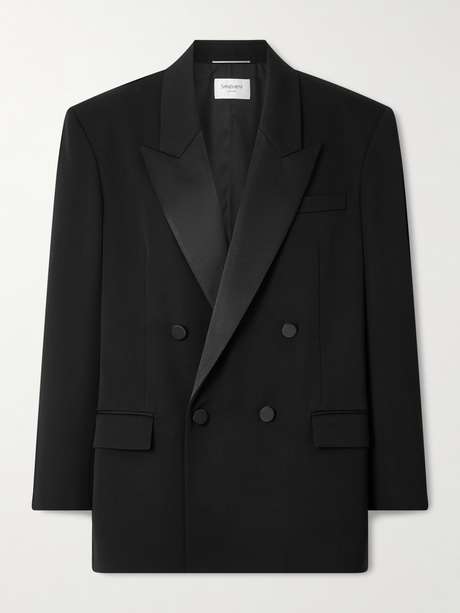 SAINT LAURENT بليزر بصفين من الأزرار من صوف غران دو بودر وحاشية من الساتان