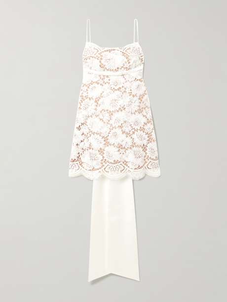 يعكس هذا الفستان من Self-Portrait توازناً ساحراً بين التفاصيل الحالمة واللمسات الدرامية، مما يمنحه طابعاً رومانسياً لا يُقاوم. صُنع من دانتيل يتحلّى بنقشة أزهار ويأتي مبطّناً لتوفير تغطية مثالية، وهو يمتاز بربطة كبيرة من الساتان تُزيّن الظهر المفتوح وأُخرى صغيرة تحت الصدر تضفي عليه لمسة أنثوية ناعمة. يمكنك تعديل حمالات الكتف الرفيعة لتناسب قياسك تماماً.