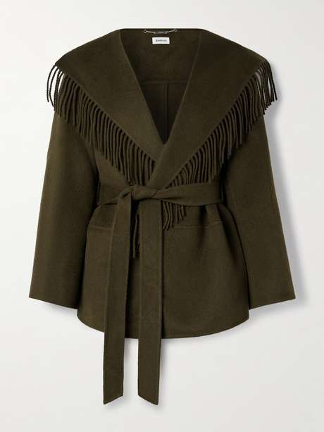 تقدّم علامة SIMKHAI جاكيت 'Rowen' المزيّن بأهداب على طول الياقة التي تأتي بشكل شال لإضفاء طابع ويسترن على الإطلالة. صُنع من مزيج لبّاد الصوف مع حزام اختياري لشدّ الخصر. يأتي بلون أخضر عسكري.