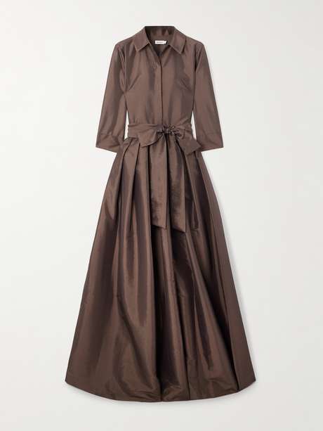 للوهلة الأولى، قد يبدو فستان السهرة 'Julip' من SIMKHAI قميصاً مطابقاً بأزرار وممرراً تحت تنورة فضفاضة. صُنع من الساتان اللامع بلون بني غني وزُوّد بحزام قابل للربط يشدّ الخصر. أكملي إطلالتك بتنسيق مجوهرات لافتة ذهبية.