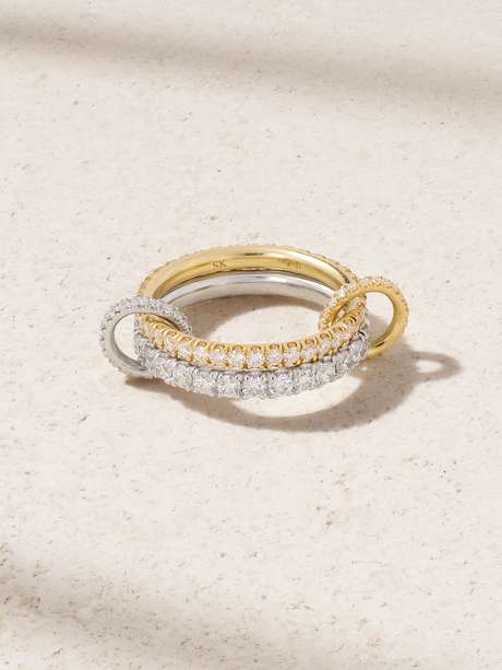 تقدّم علامة Spinelli Kilcollin خواتم 'Galaxy' المميّزة التي أطلق عليها المؤسِّس الشريك Yves Spinelli هذا الاسم بعدما لاحظ أنّ شكلها يشبه الكواكب. صُنع تصميم 'Cadence' يدوياً في لوس أنجلوس من خاتمَين متشابكَين من الذهب الأصفر والأبيض عيار 18 قيراط يتلألآن بحبات ألماس بقصة بريانت الدائرية بوزن 2.20 قيراط.