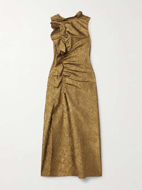 صُنع فستان 'Demetria' بتوقيع Ulla Johnson من التفتا الذهبي المجعّد، مما يعزز قدرته على عكس الضوء لتتألقي بأبهى إطلالة. وهو مصمّم بقصّة ضيقة تُعانق الجسم وتبرز جماله، ومزين بكشكش واحد ويأتي بحاشية متوسطة الطول مشقوقة. ابرزي لمعته المعدنية مع مجوهرات بلونٍ متناغم.