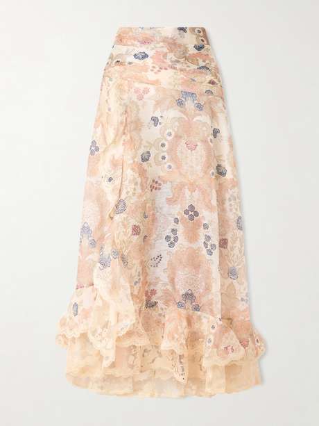 ZIMMERMANN تنورة Rebellion طويلة من مزيجٍ من الكتّان والحرير بطبعة الزهور ومزينة بالدانتيل