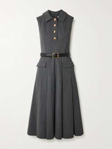 فستان متوسط الطول من مزيج صوف بحواف من الجلد مع كسرات وحزام