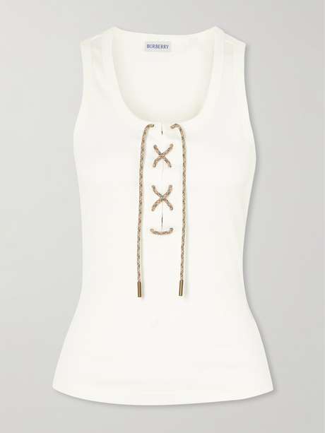 BURBERRY بلوزة بدون أكمام من مزيج قطن الجيرسي المضلّع مطرّزة وبأربطة من الأمام