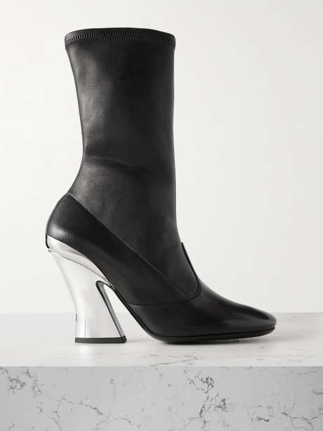 يتميز هذا البوت من توقيع Givenchy بكعبه المنحوت فضي اللون والمنقوش بشعار العلامة. صُنع في إيطاليا من الجلد المطاطي بتصميم يُغطي الكاحلين مع مقدمة دائرية أنيقة. يُمكنكِ تنسيقه مع تنانير قصيرة أو متوسطة الطول.