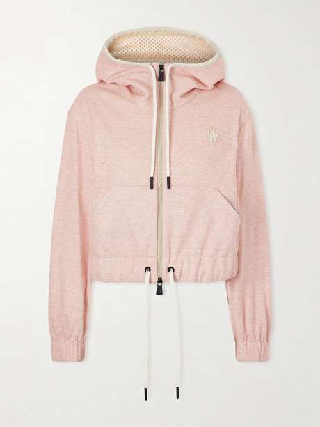 MONCLER GRENOBLE كنزة هودي بسحاب من مزيج القطن والكتان بحواف من الكنفا ومطرزة