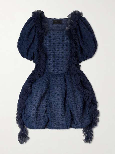 This mini dress is crafted from embroidered recycled-organza with smocked tulle detailing that shapes the bodice. Airy layers and floral motifs give it light, wing-like movement.