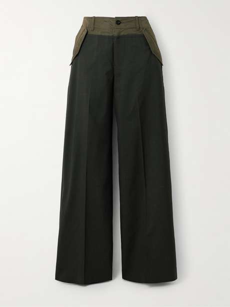 تُقدم علامة Sacai بنطال 'Glen' الذي سيبدو رائعاً بتنسيقه مع البليزر المطابق المتوفر في تشكيلتنا. يتسم بحزام خصر مع حواف من القماش العازل المتباين، وهو مصنوع من الصوف بنقشة مربعات Prince of Wales وصمم بأرجل واسعة مزينة بكسرات أنيقة. كما يأتي مع أطراف شد بأبازيم والتي تُعد من سمات العلامة المميزة.