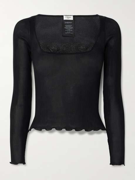 SAINT LAURENT بلوزة من الحرير المضلّع مزينة بالدانتيل