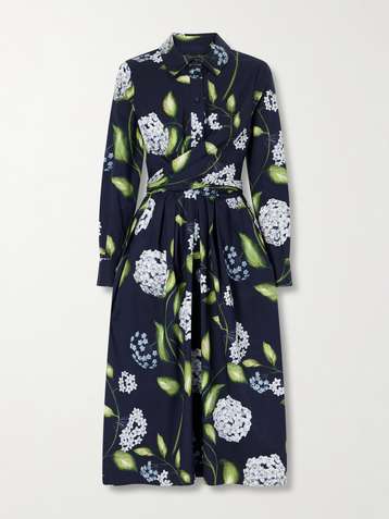 فستان متوسط الطول Foxgloves من مزيج قطن البوبلين بطبعة الأزهار مع حزام