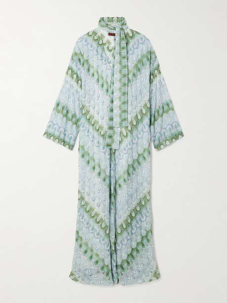 MISSONI فستان طويل مخطّط من نسيج بحبكة كروشيه بلمعة معدنية مزيّن بربطة