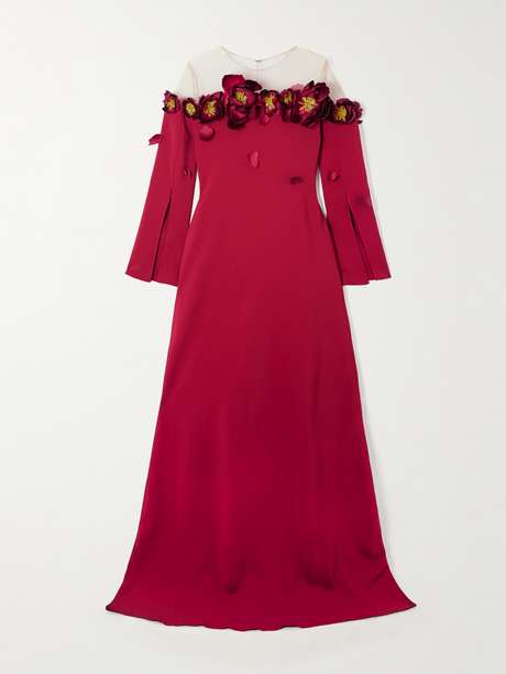 فستان السهرة هذا من Oscar de la Renta يزدان بزهور وبتلات ثلاثية الأبعاد تبدو وكأنها تتساقط من فتحة العنق متدلية الأكتاف. صنع من كريب أنيق، وينسدل بتنورة طويلة درامية تنتهي بحافة تلامس الأرض بانسيابية أخّاذة.