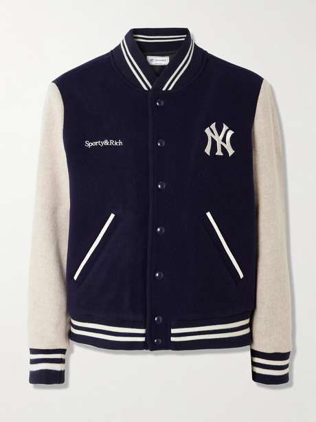 SPORTY & RICH + '47 وNew York Yankees جاكيت بومبر مطرّز من صوف اللبّاد بحواف من الجلد