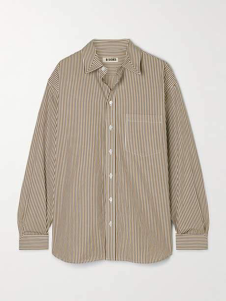 تقدّم علامة B Sides قميص 'Nolan' المخطط والمصمّم بشكل مدروس من الياقة حتى طرف الكمّ. صُنع من قطن بوبلين ياباني بتأثير ساتاني ويتسم بحاشية مائلة قليلاً ودرزات مرتّبة على الطريقة الفرنسية. تضفي الأكتاف الهابطة والقصة الواسعة طابعاً بعيداً عن التكلّف على الإطلالة.