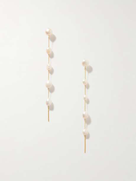 تُبدع علامة Cult Gaia في اللعب على الأشكال بأروع الطرق لتقدم لكِ مجوهرات ساحرة. وأقراط 'Atum' هذه المُصمّمة بطول يصل حتى الكتف، تتألف من سلسلة طويلة ذهبية اللون مزينة بحبات من لآلئ المياه العذبة وتتمايل بكل نعومة مع تحركاتكِ.
