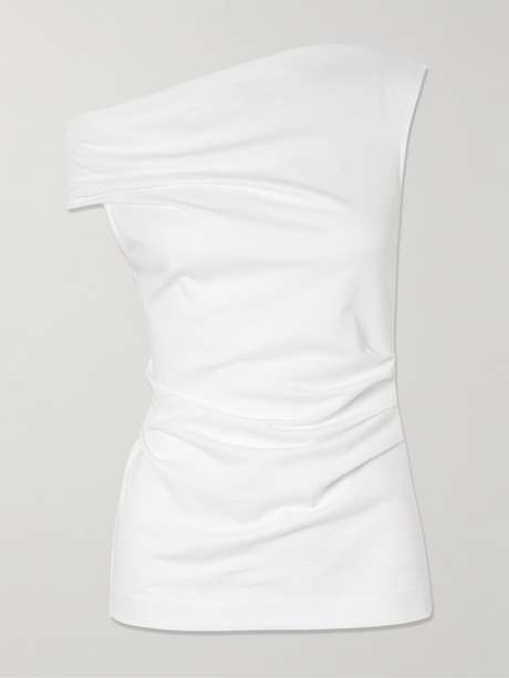 بلوزة 'Henray' من Dries Van Noten مصنوعة من جيرسي قطني ينسدل برشاقة وتأثير درابيه على كتف واحدة والصدر. ورغم بساطتها اللافتة، فهي قطعة سهلة التنسيق، يمكنك ارتداؤها مع جينز لإطلالة يومية عصرية، أو مع تنانير منسدلة لإطلالة أكثر أنوثة وانسيابية.