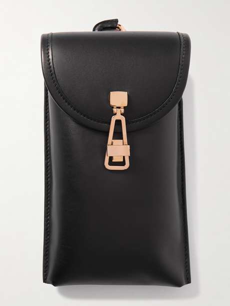صُنعت حقيبة باوتش علامة Gabriela Hearst بحرفية لا يُعلى عليها من الجلد الناعم الأسود اللون. وهي مُصمّمة بحجمٍ صغير يتّسع بشكلٍ مثالي لنظاراتك الشمسية المفضّلة. علقيها على حقيبتك بواسطة المشبك الكباس بلون الذهب الوردي المزودة به في الأعلى.