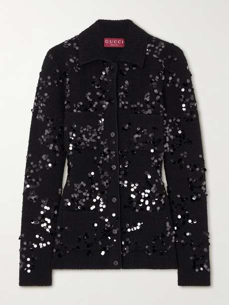 صُنع هذا الكارديغان الأنيق بتوقيع Gucci في إيطاليا من نسيج محبوك بحبكة بوكليه نافرة وهو مزين بأقراص براقة تعكس الضوء وتمنحك بريقاً ناعماً يلفت الأنظار. استوحي إطلالتك من عروض الأزياء الأخيرة ونسّقيه مع شورت وبوت بطول الركبة لمظهر عصري وجريء.