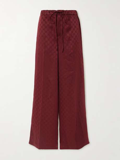 يتّسم هذا البنطال من Gucci بتصميمٍ مستوحى من بيجامات معتقة بطريقة أنيقة جداً. صُنع من الساتان الانسيابي المحبوك بتقنية الجاكار مع شعار 'GG' الأيقوني للدار وصُمّم بقصة واسعة الساقين. نسقيه مع حذاء بكعب عالٍ لإطلالة رسمية راقية.