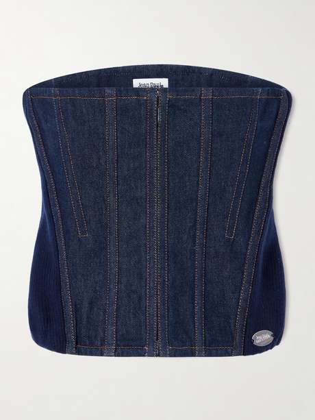JEAN PAUL GAULTIER بلوزة كورسيه من الدنيم مضلّعة بحواف من مزيج الصوف