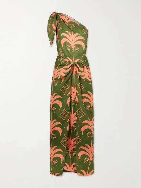 JOHANNA ORTIZ فستان Seaweed طويل بكتف واحد من الكتّان بطبعات