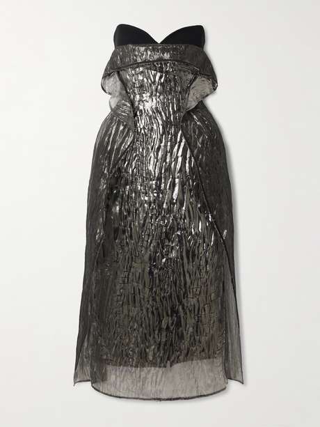 MATICEVSKI فستان سهرة De La Cruz بدون حمالات وبطبقات من قماش اللاميه والكريب